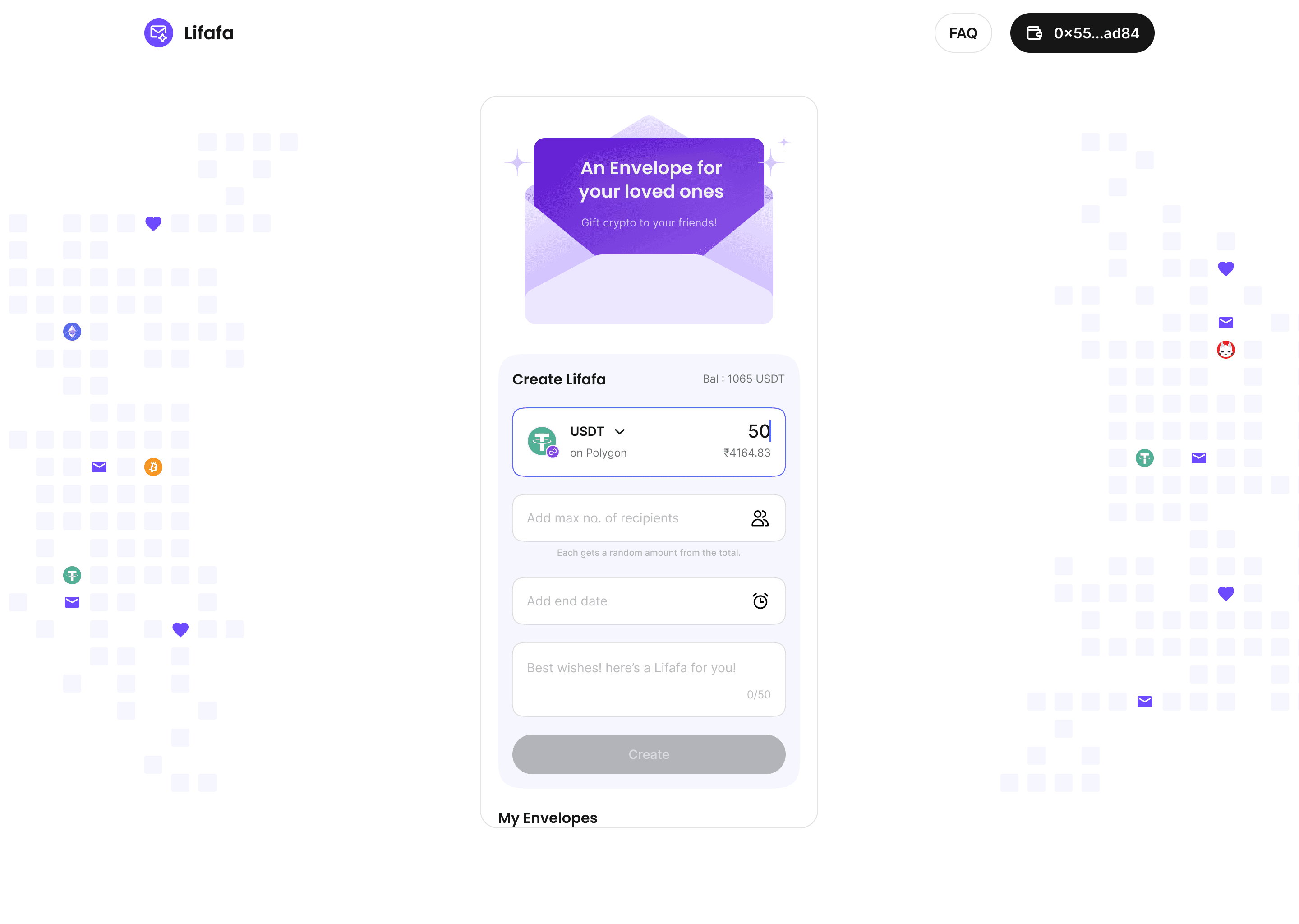 "Lifafa" is a term in Hindi indicating a meaningful envelope, similarly this is a digital platform where users can send and receive virtual envelopes containing random amounts of cryptocurrency as gifts, inspired by the traditional Chinese red packets. It combines the cultural concept of gifting with the excitement of receiving unexpected crypto amounts.