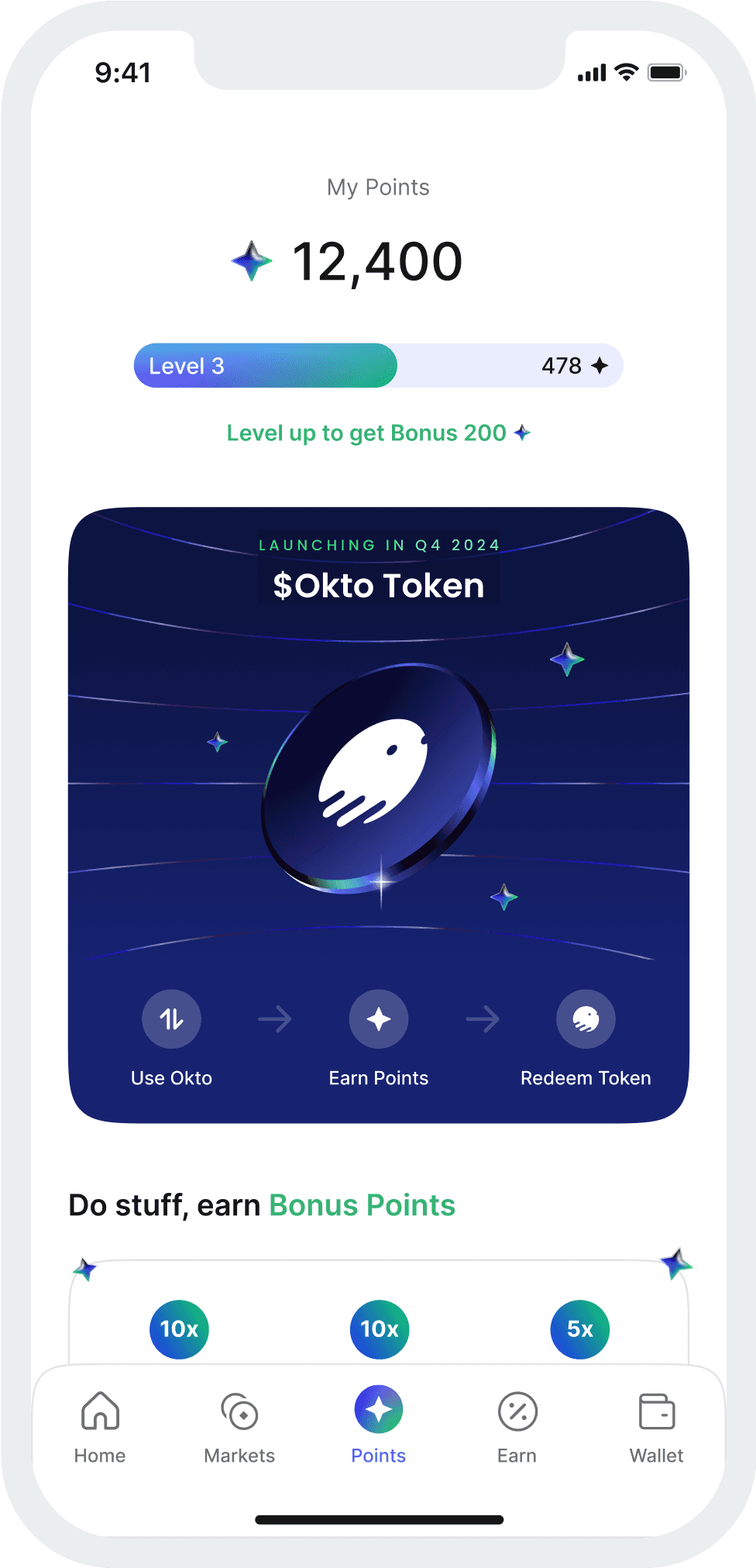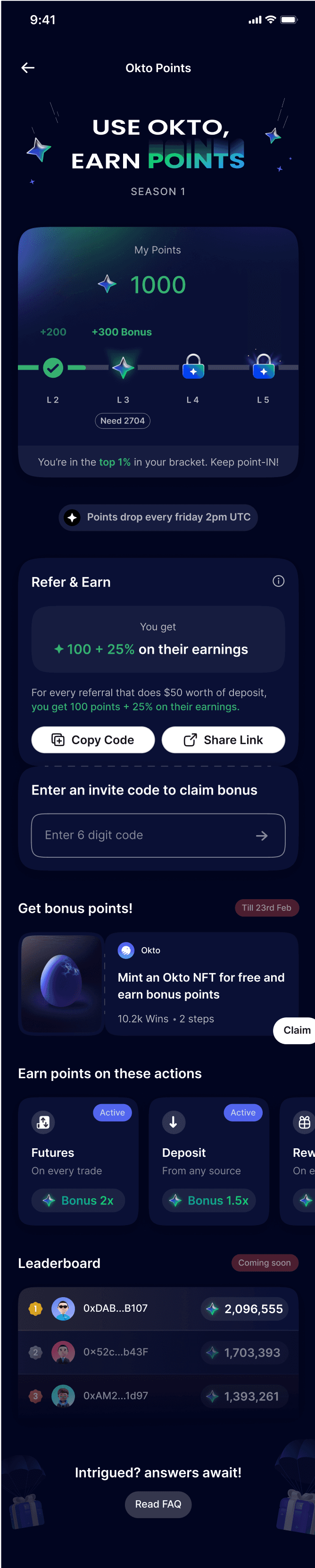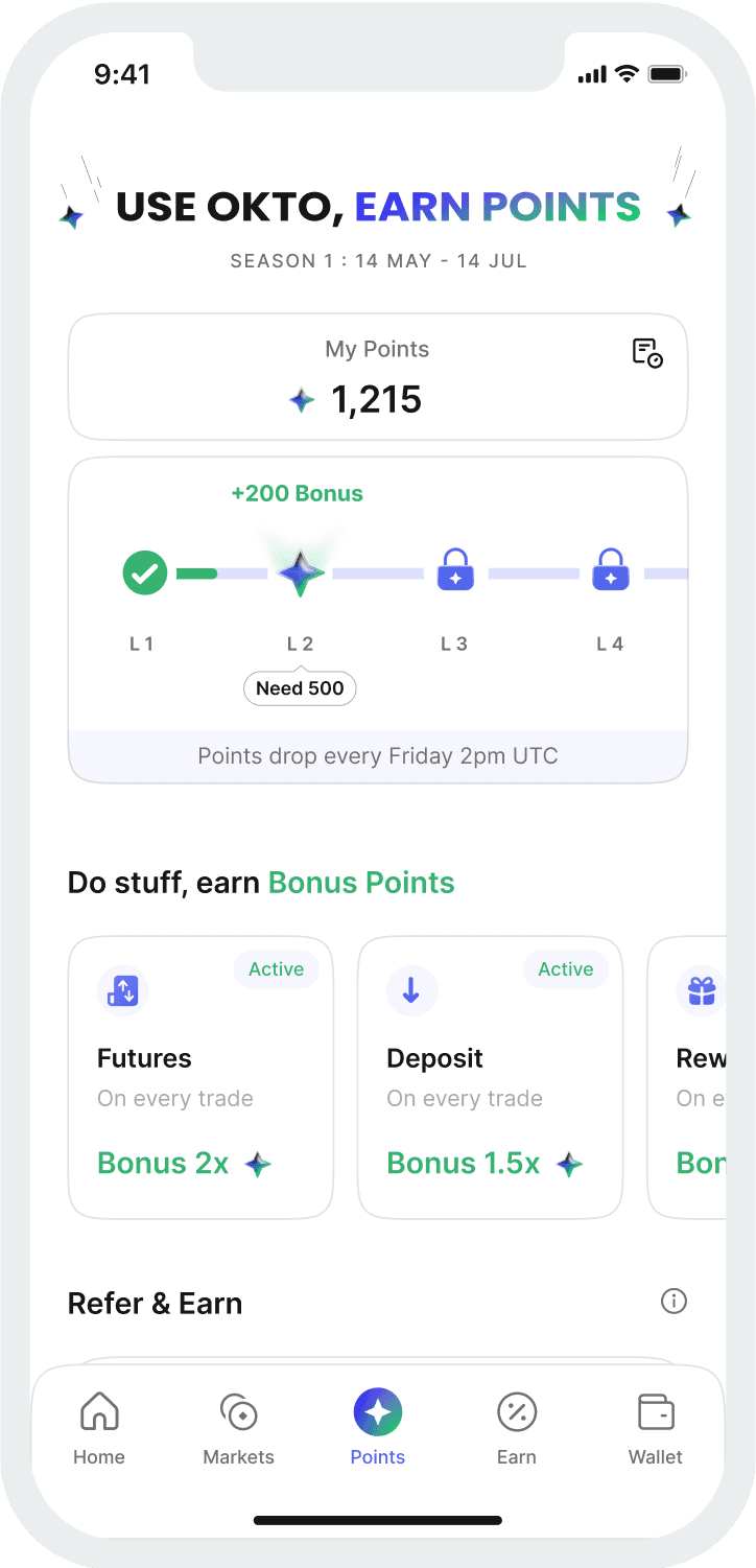 Okto Points marks the first step in integrating our community into the future success of Okto. By simply signing up, sending, receiving, earning, participating in futures, and completing quests, users accumulate points.