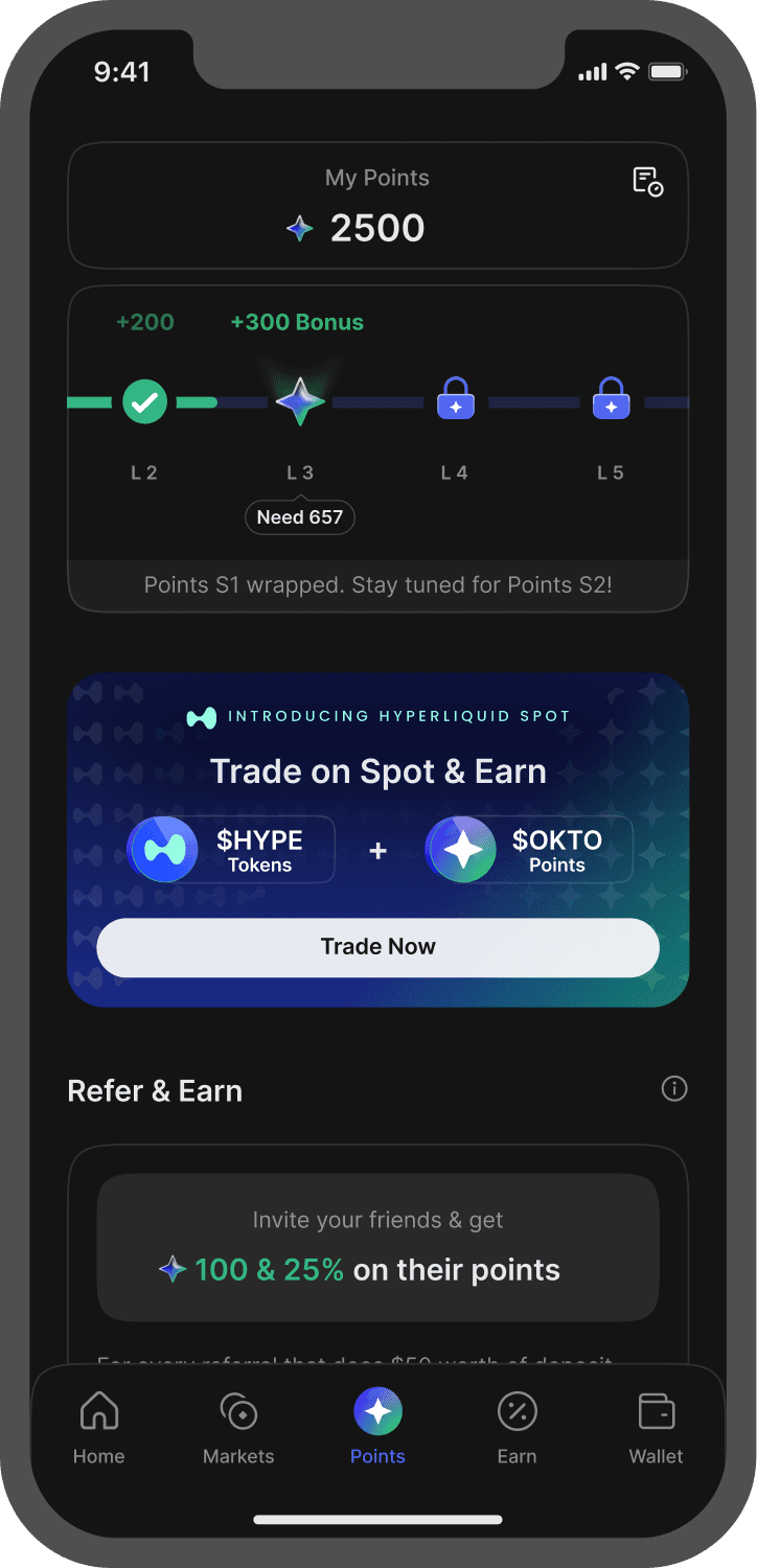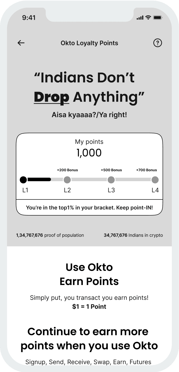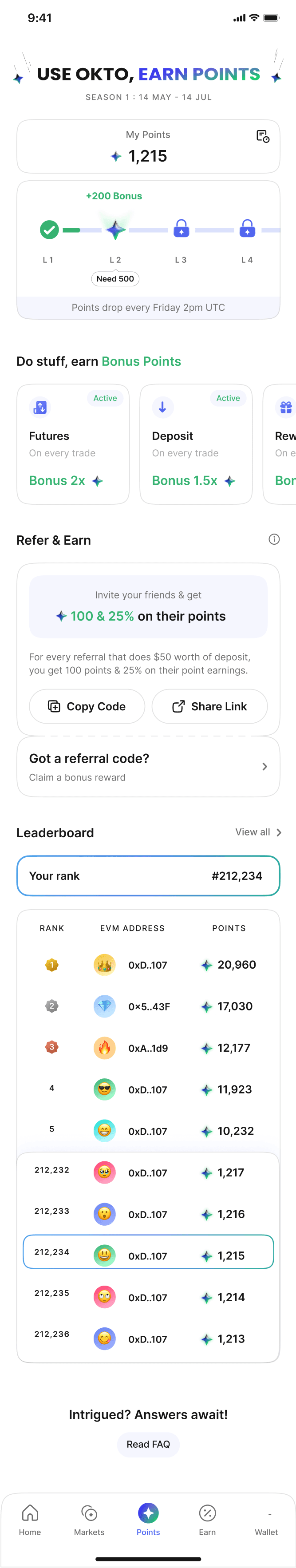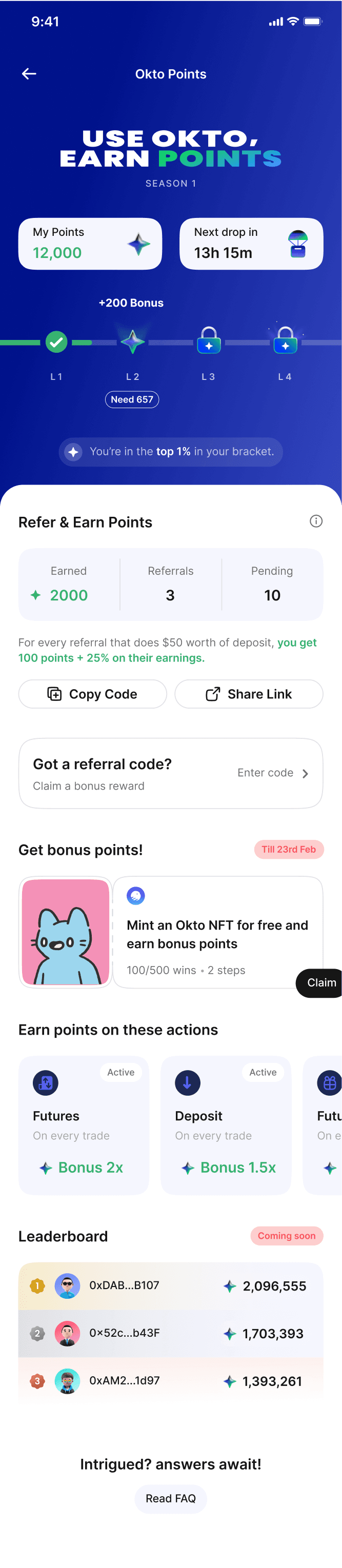 Okto Points marks the first step in integrating our community into the future success of Okto. By simply signing up, sending, receiving, earning, participating in futures, and completing quests, users accumulate points.
