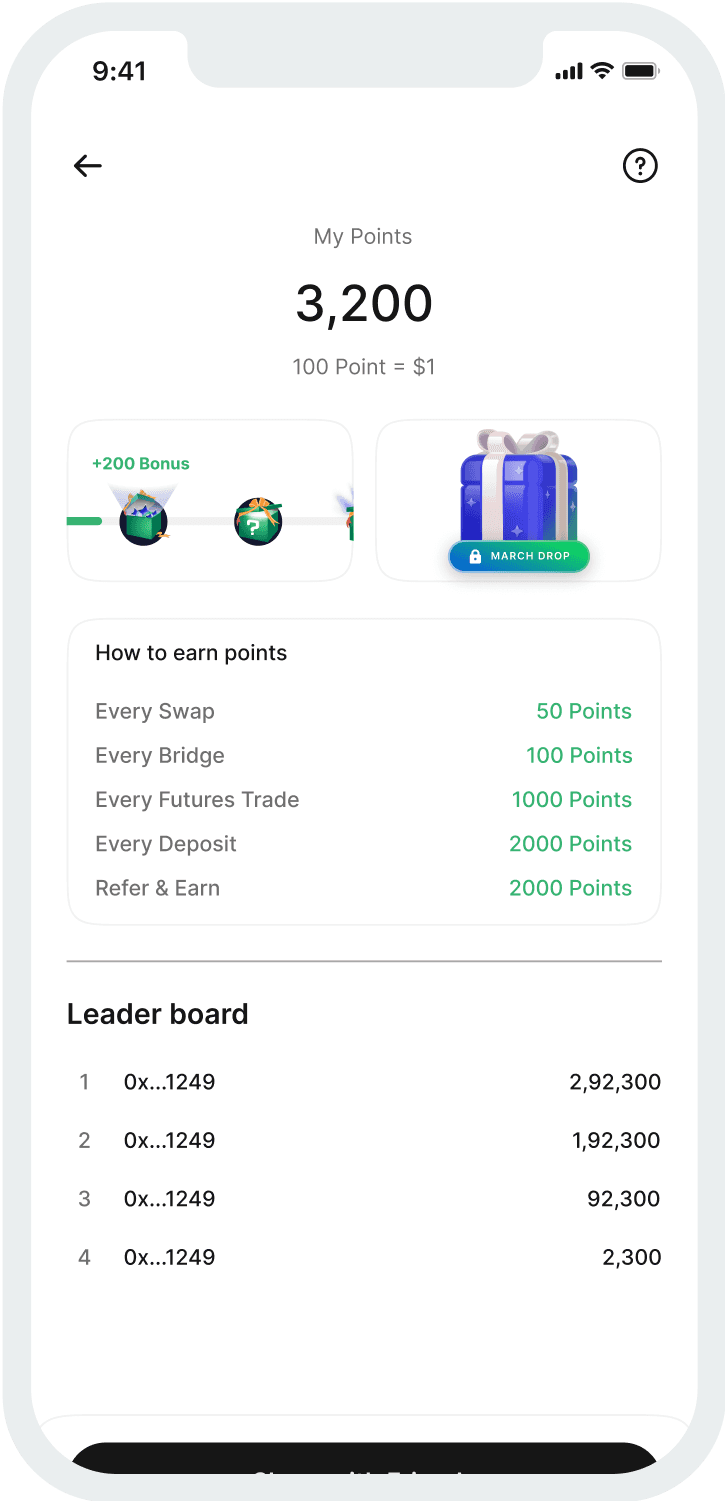 A glorifying moment where we would acknowledge their past loyalty with us retrospective bonus points! based on all their previous Swap, deposit and Trading data. Delighting the user from the very beginning