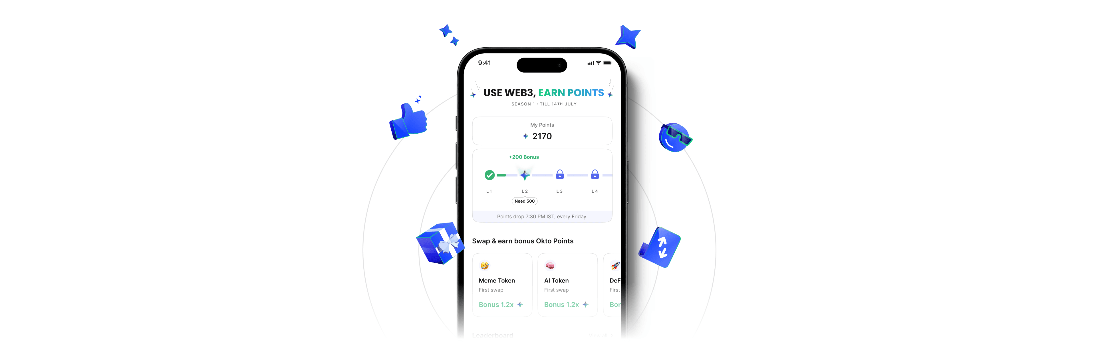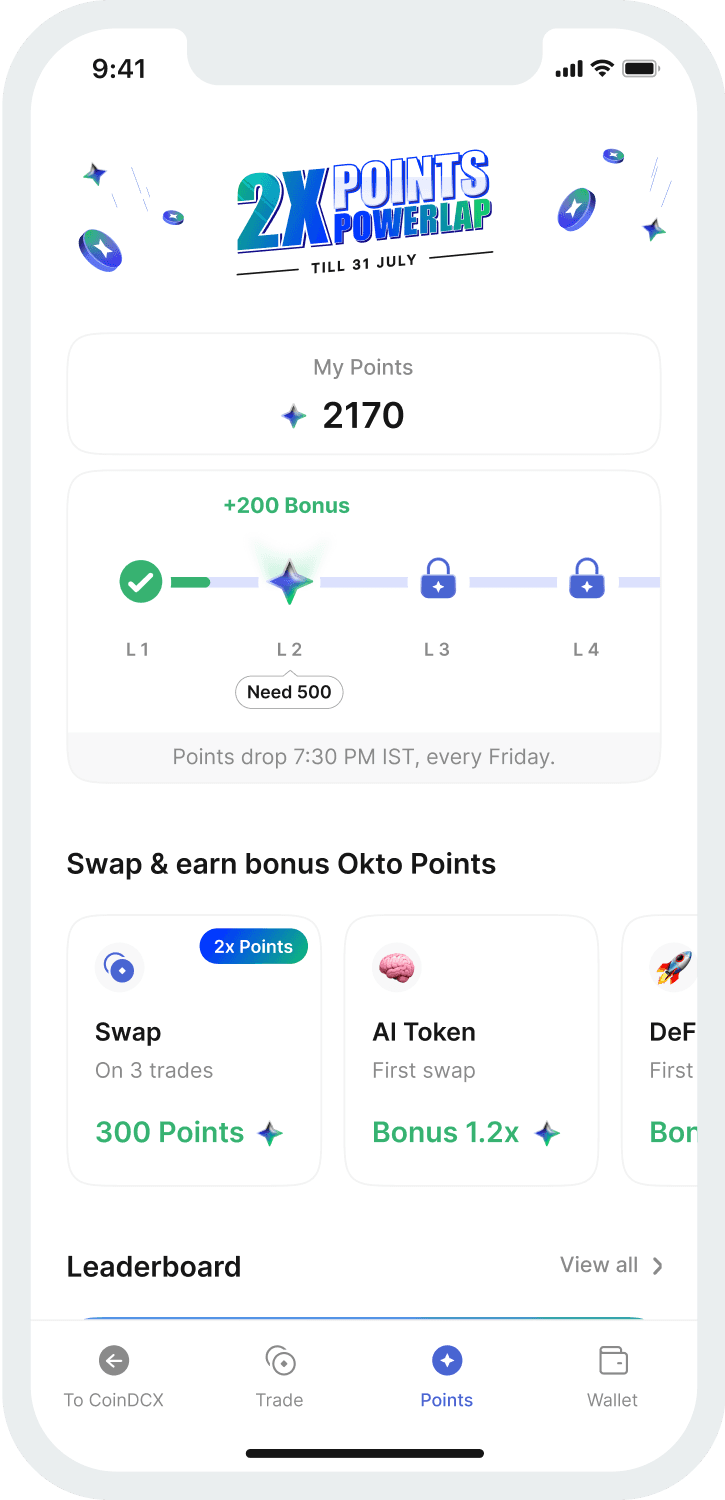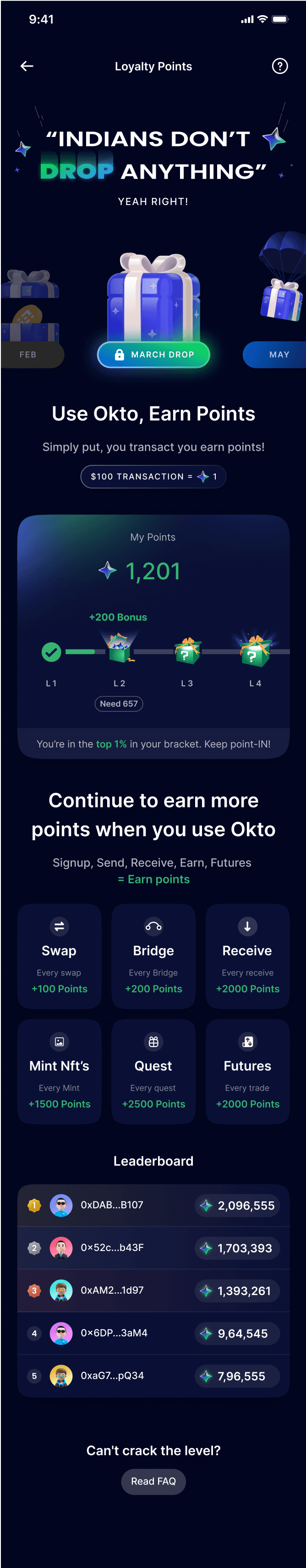 Okto Points is a loyalty rewards system designed to enhance user engagement within the Okto app and CoinDCX Web3. This program rewards users for every action they take on-chain, ensuring that participation is not just beneficial but also rewarding.